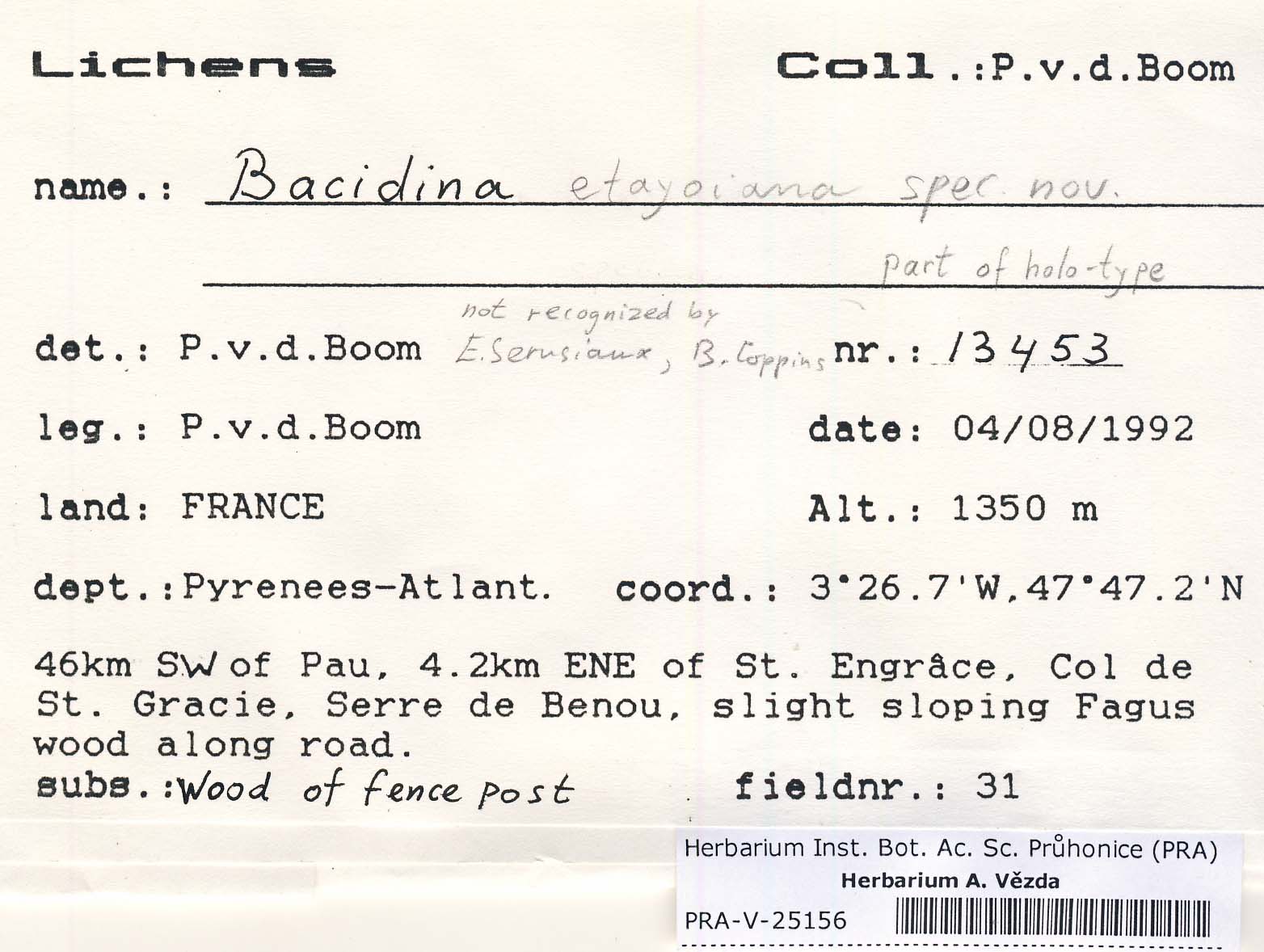 - Pyrenees-Atlant., 46 km SW of Pau, 4.2 km ENE of St. Engrace, Col de St. Gracie, Serre de Benou.