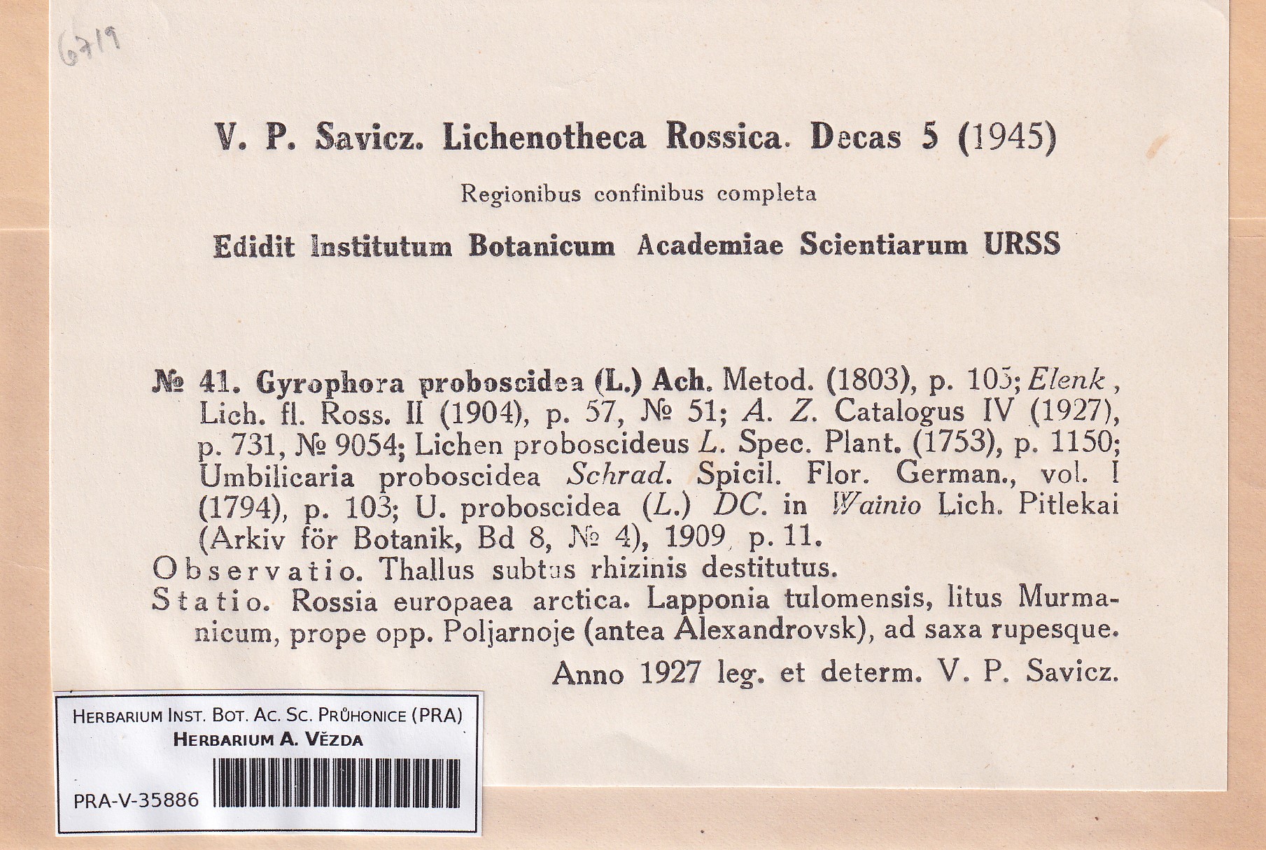 - Deposited in parcel Savicz, Lichenoth. Ross.