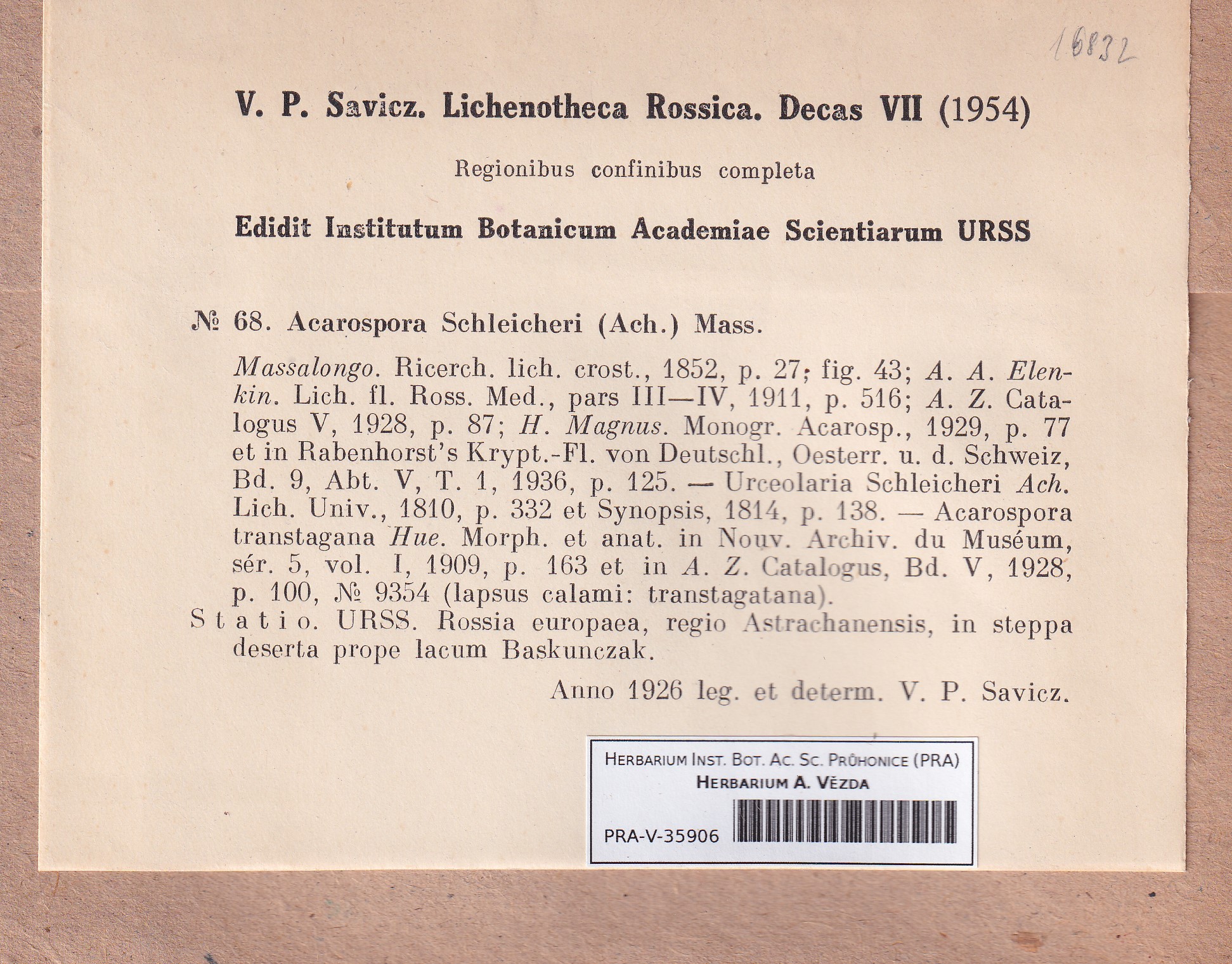- Deposited in parcel Savicz, Lichenoth. Ross.