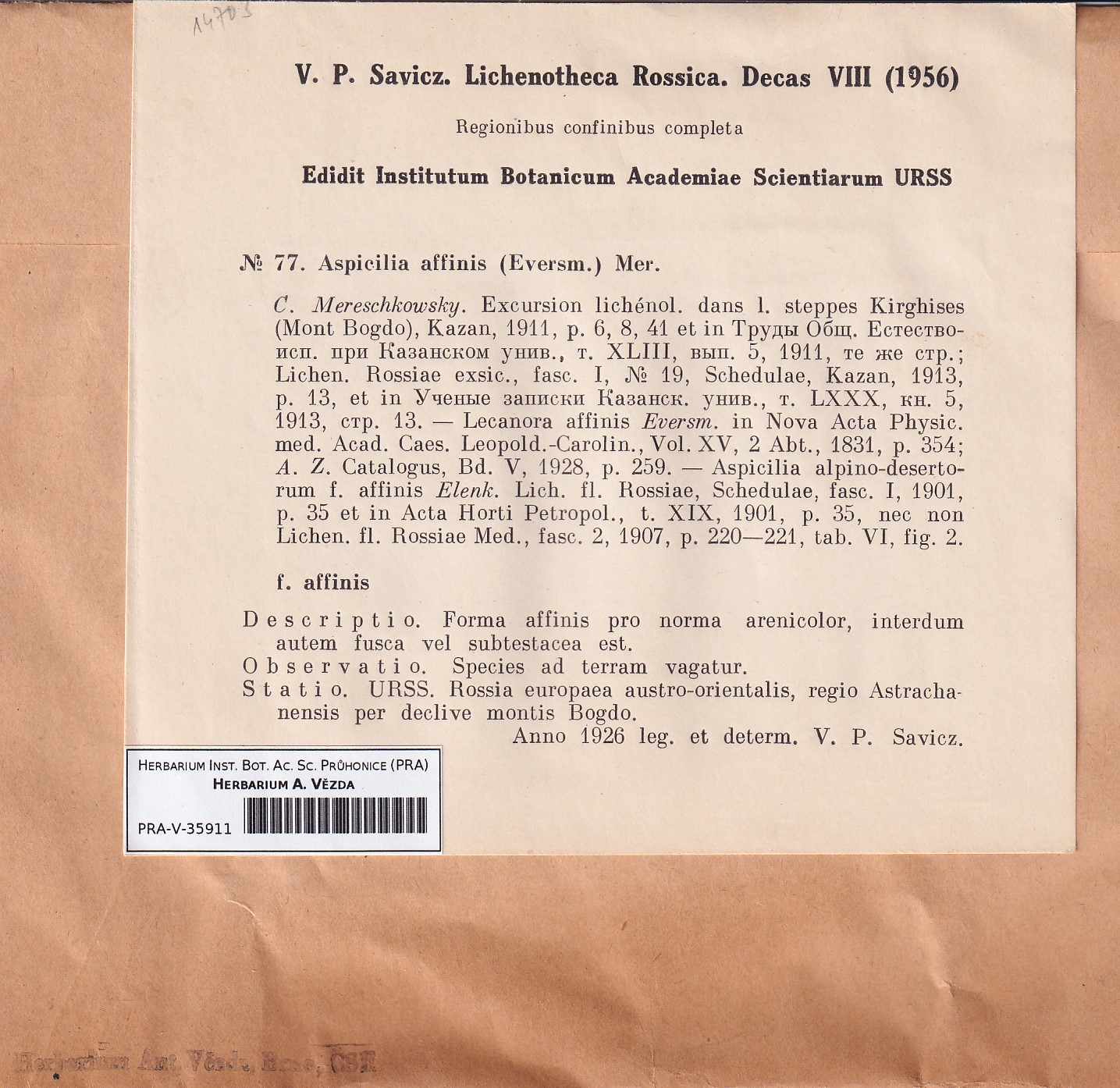 - Deposited in parcel Savicz, Lichenoth. Ross.