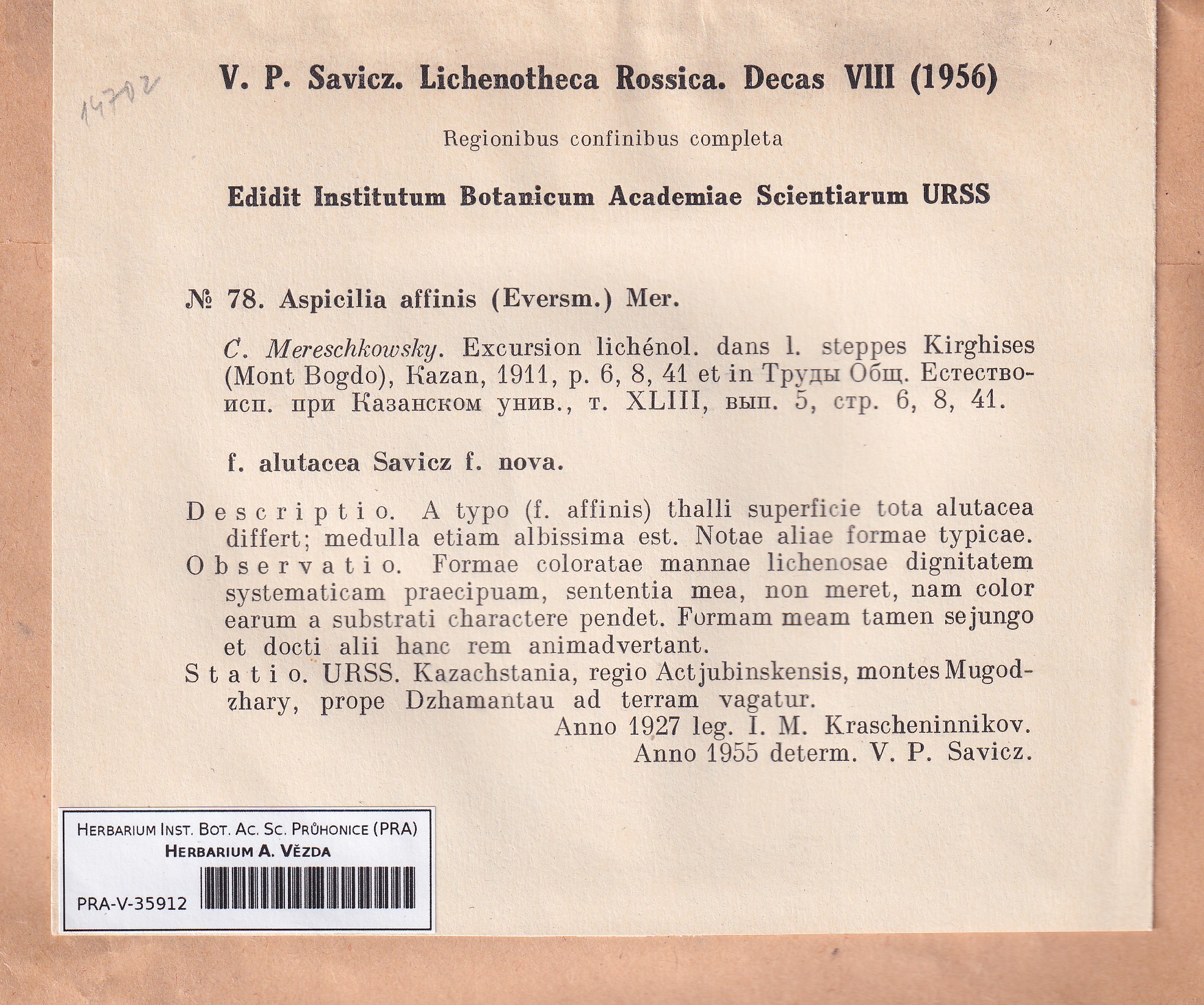 - Deposited in parcel Savicz, Lichenoth. Ross.
